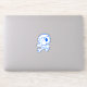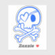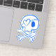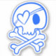 A vinyl decal with a blue skull and crossbone illustration with a heart shaped eyepatch.