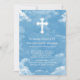 Memorial service or funeral invitation with plain white text and a white cross against a cloudy blue sky. Add your loved one's name and years living, and the details of the memorial service.