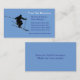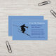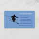 This card features a downhill skier in black silhouette, with white snow flying about him. The right side holds your easily customized business text in dark blue and white. The images and text are placed on a bright blue background. The back of the card is also blue, with an extra information field if you need it. Perfect for any business that is centred around snow skiing, winter sports or resorts, or just for fun! *Clip art used in this design is copyrighted by Encore Software, Inc., which permits use to its licensors. All rights reserved.