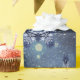 Snowflakes of blue and white on white clouds under a starry sky.