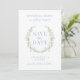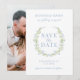 Experience sophistication with this elegant and modern rustic Save the Date invitation, adorned with watercolor delicate blue flower blooms arranged in a delicate wreath. Personalize the invitation further with a couple's photo included on the back.