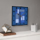 This pattern is created in the style reminiscent of Piet Mondrian. Blue shapes, squares and rectangles outlined in an ultramarine blue border. Varying shades of blue include sky blue, grey blue, and verditer blue. This abstract design focuses on form, shape and colour to evoke an emotional reaction, which speaks to our intuition, experiences and subconscious.