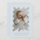 Whimsical and sweet birth announcement card featuring hand drawn photo frame of squiggly wavy line. Blue background.