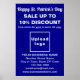 Blue poster for St. Patrick's Day that you can customize by specifying the discount percentage, sale dates, uploading your business logo, typing your business name, address, phone number, email and website. Customize it and display it to attract more customers to buy your products or clients to like your services. Please check the appearance after uploading logo and typing texts. If the appearance is pleasing to you, you can place your order now. If you need to resize and reposition the logo and texts to fit on this poster or on the size and style that you've chosen, please adjust in the design tool. You can also change the background colour, font colour and font style in the design tool. Happy St. Patrick's Day! Wishing you the best of luck, joy and more sales this holiday.