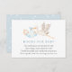 A book request insert card for baby shower. Featuring a watercolor stork carrying a baby wrapped in a blue blanket with poem: "ONE SMALL REQUEST, WE HOPE NOT TOO HARD
