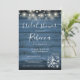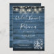 A rustic bridal shower invitation featuring pretty string lights and mason jars with stylish script typography, on a blue rustic wood background. Designed by Thisisnotme©