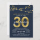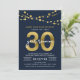 Elegant 30 Year Class Reunion invitation featuring strings of lights and "30" in faux gold foil with "year reunion" in white against a dark blue background on the front and a dark blue and faux gold polka dot pattern back side. Check out other matching items here https://www.zazzle.com/collections/school_reunion-119258151199573326?rf=238364477188679314