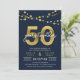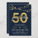 Elegant 50th Anniversary invitation featuring strings of lights and "50" in faux gold with "years together" in white against a dark blue background. Card includes a matching pattern back side. Check out matching items like stickers and stamps here https://www.zazzle.com/collections/strings_of_lights_faux_gold_celebration_collection-119311942951401241?rf=238364477188679314