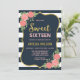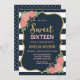 Throwing the birthday girl a party to celebrate turning 16? Invite friends and family with this pretty sweet sixteen invitation featuring a faux gold border, blue and white stripes, blush pink roses and a patterned back side.