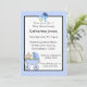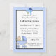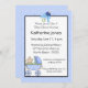 Baby Shower invitations for boys with a cute baby in a blue baby stroller. Invitation also has a baby rattle and blue bow . Use our easy template to add your party information.