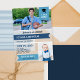 Acrylic graduation party invitation personalized with two photos of the graduate. On a light blue swallowtail flag at the top right corner, a graduation cap and class of the year. Add your son's name in white against a deeper blue swallowtail flag running across the blue, white, and transparent acrylic graduation party invitation.