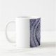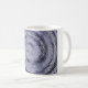 An abstract graphic, with a circular, geometric, pattern swirling in a whirlpool-of varying, hues of blue, and purple.