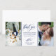 Photo card personalized with two of your own wedding photos. Thank you written in an elegant swirly deep blue script above a personal message to your wedding guests. Add your names too!