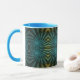 Coffee mug with "Blue Tango" an abstract design copyright © 2009, Susan Wallace. Textured fans in shades of blue and green swirl and spiral together, meeting in pinpoints of neon bright light. Full wrap-around design.