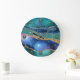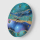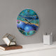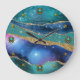 Chic decorators wall clock done in graphics of a blue, teal and gold glitter agate looking layers, with gold studs and teal stone like jewels for the hour marks.
