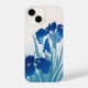This is a colourful vintage watercolor drawing of blue irises with teal leaves on a light peach background.