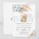 Celebrate in style with this charming baby shower invitation featuring a sweet teddy bear holding balloons, elegant floral accents in soft blue and beige, and modern typography. Perfect for honoring parents-to-be, this customizable card sets the tone for a joyful gathering. Designed with a timeless pastel palette, its ideal for baby showers, gender reveal parties, or welcoming a little one. Personalize with event details to create a keepsake guests will love.