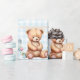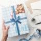 Sweet blue and white pastel plaid baby shower wrapping paper with “Baby” with sweet watercolor teddy bear. Perfect for all your baby shower gifts.