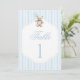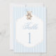 Celebrate the arrival of your little one with our adorable teddy bear–themed baby boy shower table numbers. This elegant preppy design showcases a sweet teddy bear with a blue bow, holding a blue balloon, surrounded by a light blue striped pattern. Perfect for a stylish, classic, or vintage baby boy shower, these charming table numbers add a polished touch to your décor. Ideal for preppy baby shower themes, cute baby boy celebrations, and modern baby shower decorations.
