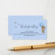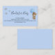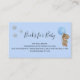 A bring a book request, ticket insert for a baby shower. A light blue background. Decorated with a teddy bear boy holding a blue balloon.