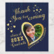 Create a unique blue Thank You wine label for the Graduation party favours with an elegant design that features a photo in a heart shape, the Graduate's name, and year. Use the template to type your Grad's name and year and upload a picture.