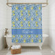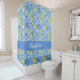 Bring a touch of Mediterranean charm to your bathroom with this elegant shower curtain featuring a vibrant French country blue tile pattern accented by lush yellow lemons. The design includes a stylish center band that can be personalized with a name, your initials or a saying, making it a refreshing and custom addition to any home decor.