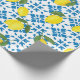 This wrapping paper features a watercolor French country tile and lemon pattern in blue and yellow.