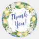 Designed to coordinate with the Jenny's Lemon Collection, this bridal thank you sticker features a yellow lemon and white floral wreath. There is a hint of the blue tiles around the edge of the round sticker. Thank You is written in a modern and trendy script font.