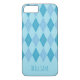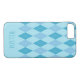 An iPhone 7/8 case designed with an argyle pattern in blue tones. Customize the iPhone case with your name or text among other options.
