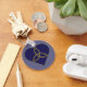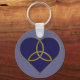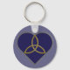 This keychain features a gold Trinity Knot inside a silver heart. The inside of the heart is dark blue, the background a lighter blue.