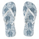 White flip flops with a pattern of blue and white tropical leaves, these are perfect to dress up your outfit for any occasion.