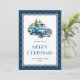 Blue buffalo plaid Merry Christmas card featuring a blue retro truck. Easily personalize this snowy holiday card with your family name and the year.