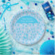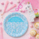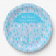 Blue custom baby shower paper plate, with graphics of a white and turquoise blue raindrop pattern and a big turquoise blue umbrella. Personalize the white text to read what you want. Matching invitations and other party supplies are available.