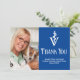Custom blue veterinary school graduation thank you cards with the veterinarian medical caduceus next to your graduate photo. Customize these cards of thanks with chic white script next to your photograph for your animal clinic.