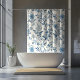 A detailed vintage floral illustration in blue tones, featuring delicately drawn branches, leaves, and blossoms on a light background, creating a classic and elegant botanical look. Toile-de-Jouy