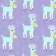 A whimsically illustrated blue vintage reindeer prances across a lavender background.