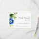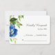 The front of this pretty wedding response card features a pretty blue watercolor floral image nestled among green leaves. Your custom text is in grey at the right. The floral image and the text are placed on an elegant white background. The back of the invitation is also white. This response card matches the wedding invitations by the same title, and other wedding products in our store.