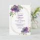 A double oval gold frame is decorated with two bouquets of blue and violet pink wild roses and soft green leaves on this pretty bridal shower invitation. Your custom text is in matching dark blue and purple violet in the centre. The top third also has a sparkling gold confetti spray. The images and text are placed on an elegant white background. The back of the invitation is matching dark blue, with the same confetti overlay. Beautiful, modern, and chic! The colours in this invitation are appropriate from spring through autumn.