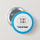 Personalize this round pinback volunteer button with your event or organization logo, volunteer title, name, or other custom text. This template has a white background with a light blue border that can be customized to different colours. The round button is available in 6 sizes: 1.25 inch, 2.25 inch, 3 inch, 4 inch, and 6 inch. No minimum order quantity and no setup fee. Made in USA.