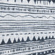 Blue and white wallpaper with a geometrical pattern made of drawn stripes and shapes.