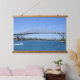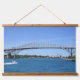 The Blue Water Bridge spans the St. Clair River, connecting Port Huron, Michigan (on the left) with Point Edward in the Province of Ontario, Canada. A motor boat is about to zoom under the bridge and pass by proud flags of America and Canada, on the port side. Beyond the bridge, the river curves to the right and flows into Lake Huron.