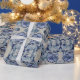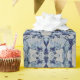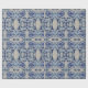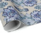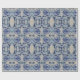 A decorative mirrored pattern of blue stylized water lily images adorn this pretty wrapping paper.