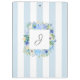 A personalized clipboard with chic feminine style, this design has a light blue and white awning stripe background with a square floral frame surrounding your monogram with beautiful blue and white mixed blossoms. Edit the monogram with your desired initial or other text. This design is repeated on both the front and back of the clipboard.