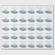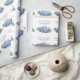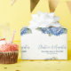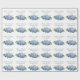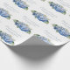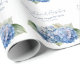 This wrapping paper features a floral watercolor design with blue hydrangeas. A delicate bouquet of hydrangea flowers is pictured below the names of a couple, followed by a sample wedding date and location. You can personalize the wrapping paper to include your own names or other custom text.