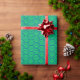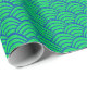This wrapping paper has an art deco design of blue curved lines in a triangle shape on a field of green repeated across the design. Want a different colour? Message me.