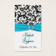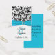 This black and white damask Wedding Favour card has an aqua blue PRINTED ribbon and PRINTED diamond jewel brooch that would be perfect for an aqua and black themed wedding. **NOTE, if you change the size of the card, or if you change the fonts, or the size of the font, some of the design and/or text may get cut-off. Everything will print as you see it on your monitor. I will not see changes you make, and Zazzle will NOT correct anything (typos, mis-alignment etc.). The text is all customizable. If you need help with this product, please email me BEFORE you place your order. If you require any other matching items, please email your request to niteowlstudio@gmail.com