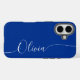 Blue White Elegant Calligraphy Script Custom Personalized Name iPhone 16 Smart Phone Cases features a modern and trendy simple and stylish design with your personalized name in elegant hand written calligraphy script typography on a blue background. Designed by ©Evco Studio www.zazzle.com/store/evcostudio