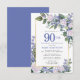 Honour a special woman with this elegant and feminine 90th Birthday party invitation. 90th is written in large blue text. Birthday celebration follows. The honoured guest's name is also in blue capital letters. The remainder of the text is soft dove grey. The birthday celebration details are surrounded by a chic gold frame that is decorated with white roses and blue flowers. The floral elements are nestled in deep green leaves. While it is a traditional design, the open and airy botanical foliage and text give it a contemporary vibe. The invitation back is a barely there deep blue.