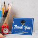 This modern blue and white custom graduation thank you card features classy handwritten thanks above your high school or college name for the class of 2025. Customize with your name under the black grad cap for great personalized graduate thank you cards.