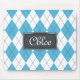 Preppy modern girly colourful cute argyle pattern in blue, white and grey with a customizable nameplate for you to personalize your name. Trendy vector diamond geometric retro pattern.